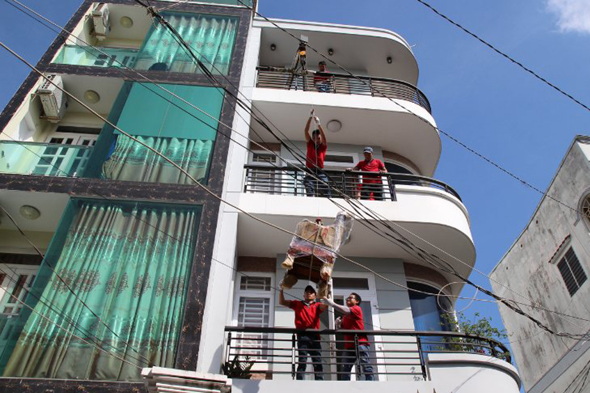 Sử dụng ròng rọc vận chuyển đồ nội thất từ lầu 5 xuống tầng trệt